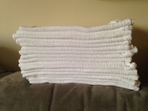 Mikor annak idején elkezdtem összegyűjteni a babakelengyét, többen a lelkemre kötötték: a hagyományos tetra-/textilpelusra bőven számoljak rá, kelleni fog. A listák 10 db-ot javasolnak kezdésként, a védőnőm 20-at ajánlott. Be is szereztem 24-et, ezzel az induló csomaggal vártuk haza Danit. Azonban alig telt el néhány hét, kiderült, hogy bizony nem tudok elég gyorsan mosni-vasalni, valahogy mindig hiányban szenvedtünk, ezért a textilpelusok számát 32 db-ra emeltem itthon. Ez az a mennyiség, amivel most jól elvagyunk.